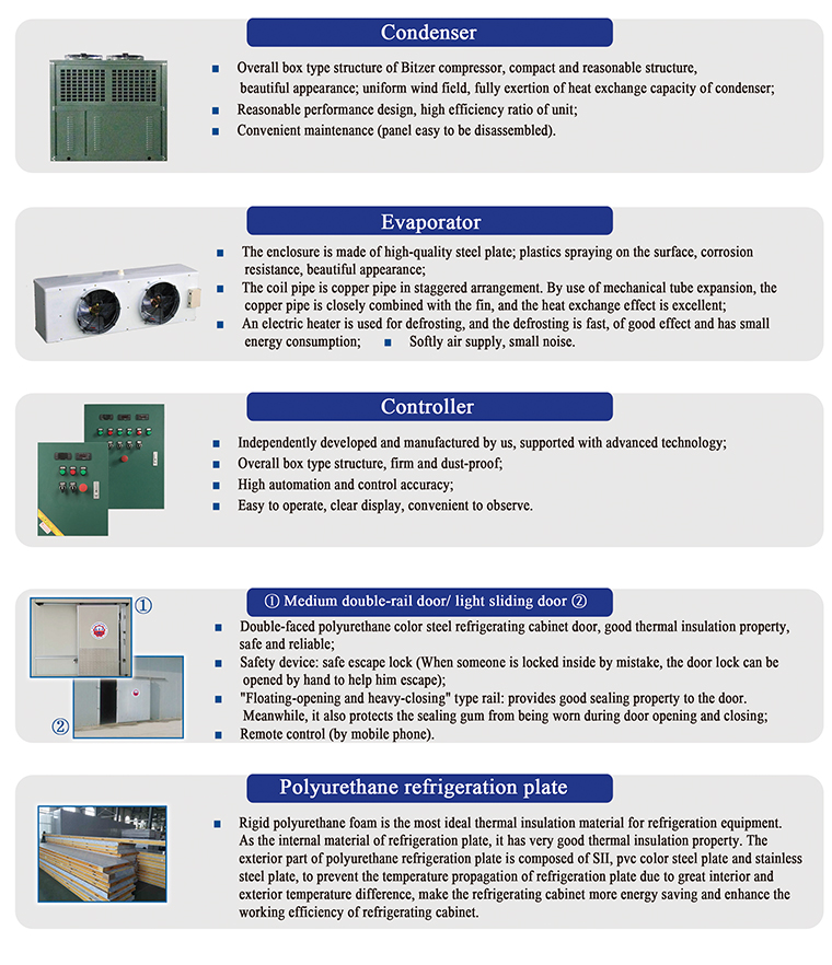 Wide applicable scope, storage capacity of 5-200 tons of various foods, conformity to food sanitary standard internally, storage of vegetables, fruits, marine products, ice blocks, etc.